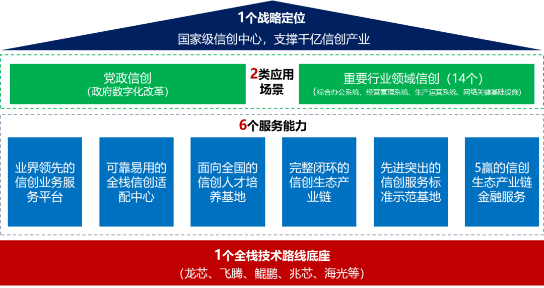 信创服务业务平台是载体。神州信息在争创国家级信创中心、支撑千亿信创产业集群的战略定位之下,基于全栈技术路线底座,通过“业界领先的信创服务业务平台”、“可靠易用的全栈信创适配中心”、“面向全国的信创人才培养基地”、“完整闭环的信创生态产业链”、“先进突出的信创服务标准示范基地”以及“5赢的信创生态产业链金融服务”这六大服务能力,实现重要行业领域信创(综合办公系统、经营管理系统、生产运营系统、网络关键基础设施)和党政信创(政府数字化改革)两类场景应用,构建全国领先的信创金华模式设计蓝图。