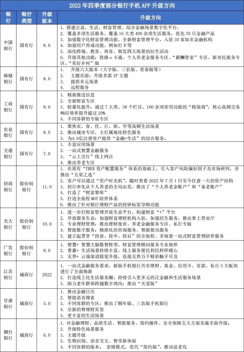 其中,据不完全统计,2022年第四季度,共有工商银行等5家国有行、招商银行等3家国有行、江苏银行等2家城商行从养老金融、财富管理及场景建设等方向升级了个人手机银行: