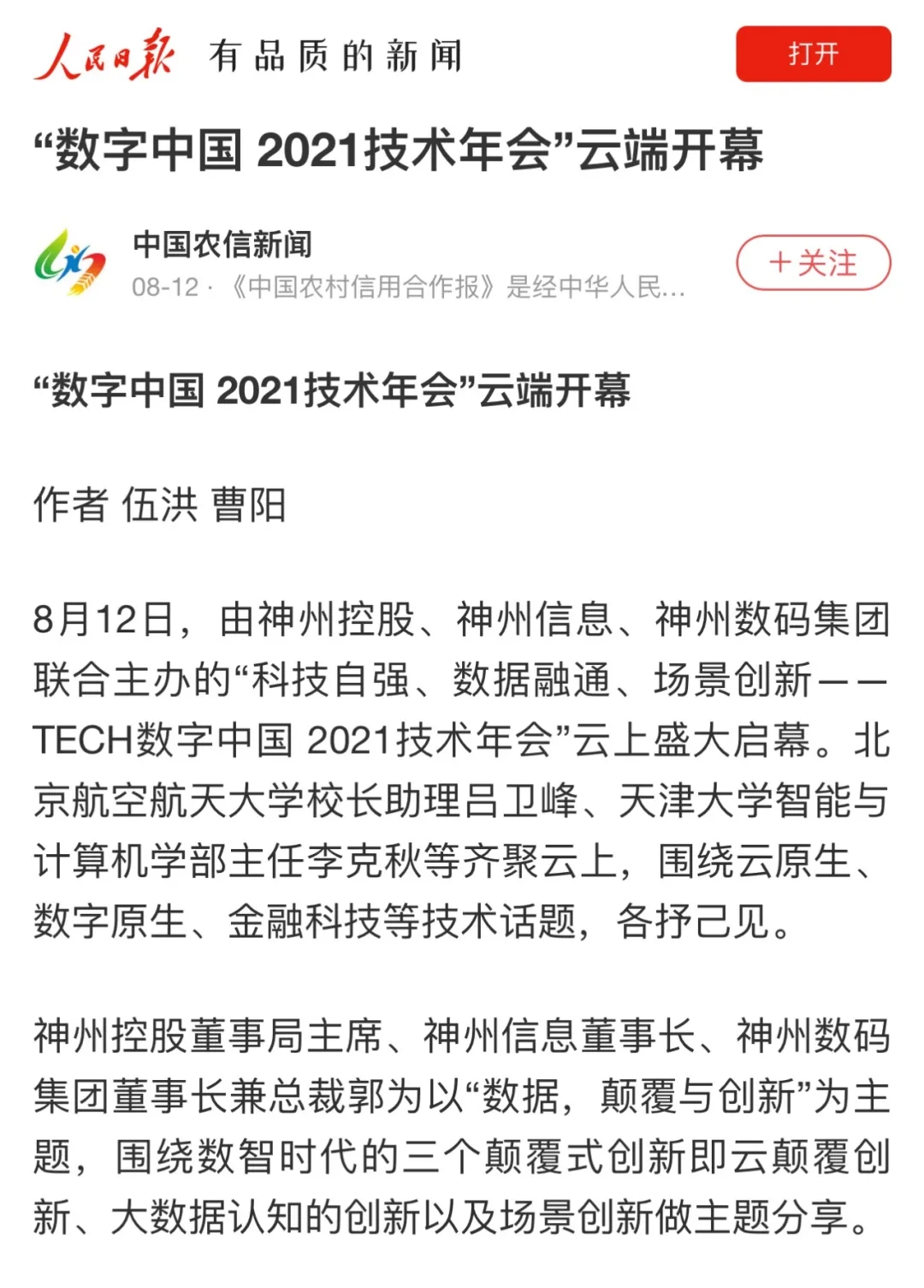 8月12日,由神州控股、神州信息、yabo.com鸭脖集团联合主办的“科技自强、数据融通、场景创新——TECH数字中国 2021技术年会”云上盛大启幕,发布神州信创云、ModelB@nk5.0、金融超脑Sm@rtFSB、云原生数字化安全底座、园区智能体等重磅产品,国内各大权威、影响力媒体多角度多频次对盛况进行报道!