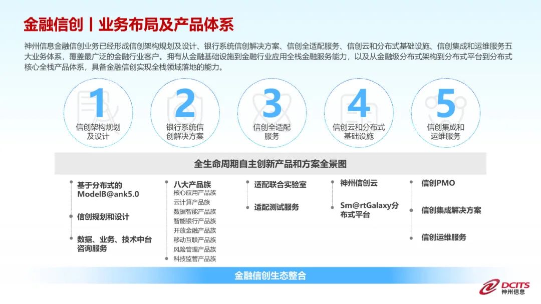 层次三:全栈信创架构建设,结合企业更高的追求,搭建完全基于国产生态的数字化平台,构建符合云原生、数字原生趋势的新一代IT整体信创架构,实现业务连续性、系统开发敏捷性、金融业务智能化等目标。神州信息2021年发布了第五代银行整体架构ModeB@nk5.0,不仅从IT整体架构层面考虑国家信创工程的落地支撑,更以云原生、数字原生技术为支撑,数据要素为核心,支撑未来金融机构面向场景化、旅程化的服务,释放应用系统的潜力,推动金融机构数字化转型。